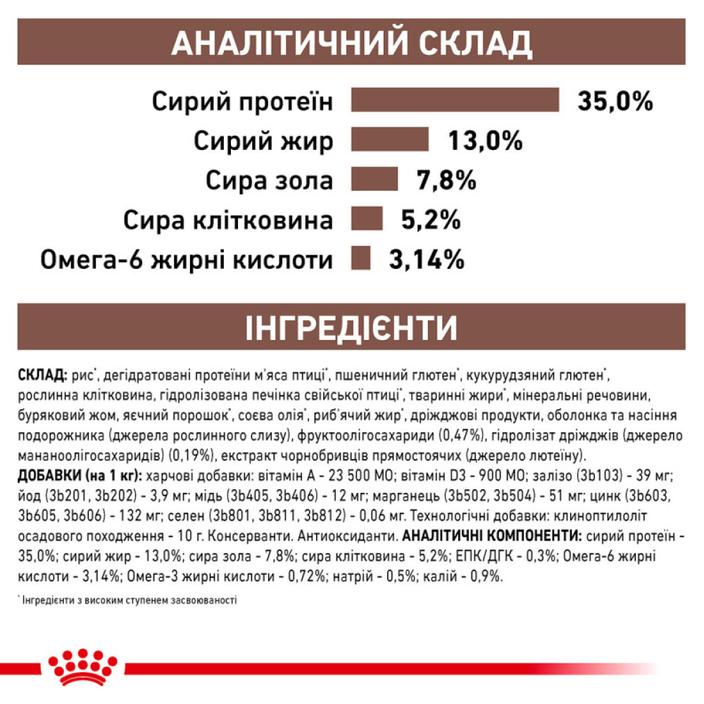 Аналитические компоненты: сырой протеин - 35,0%; сырой жир - 13,0%; сырая зола - 7,8%; сырая клетчатка - 5,2%; ЭПК/ДГК - 0,3%; омега-6 жирные кислоты - 3,14%; омега-3 жирные кислоты - 0,72%; натрий - 0,5%; калий - 0,9%.