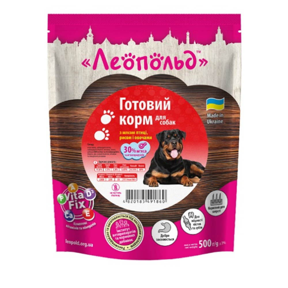 Консервы для собак Леопольд Готовый корм с мясом птицы, рисом и овощами – это полноценное питание, в состав которого входят только натуральные продукты, а также многие полезные минералы и витамины, позволяющие Вашему любимцу быть здоровым и довольным.