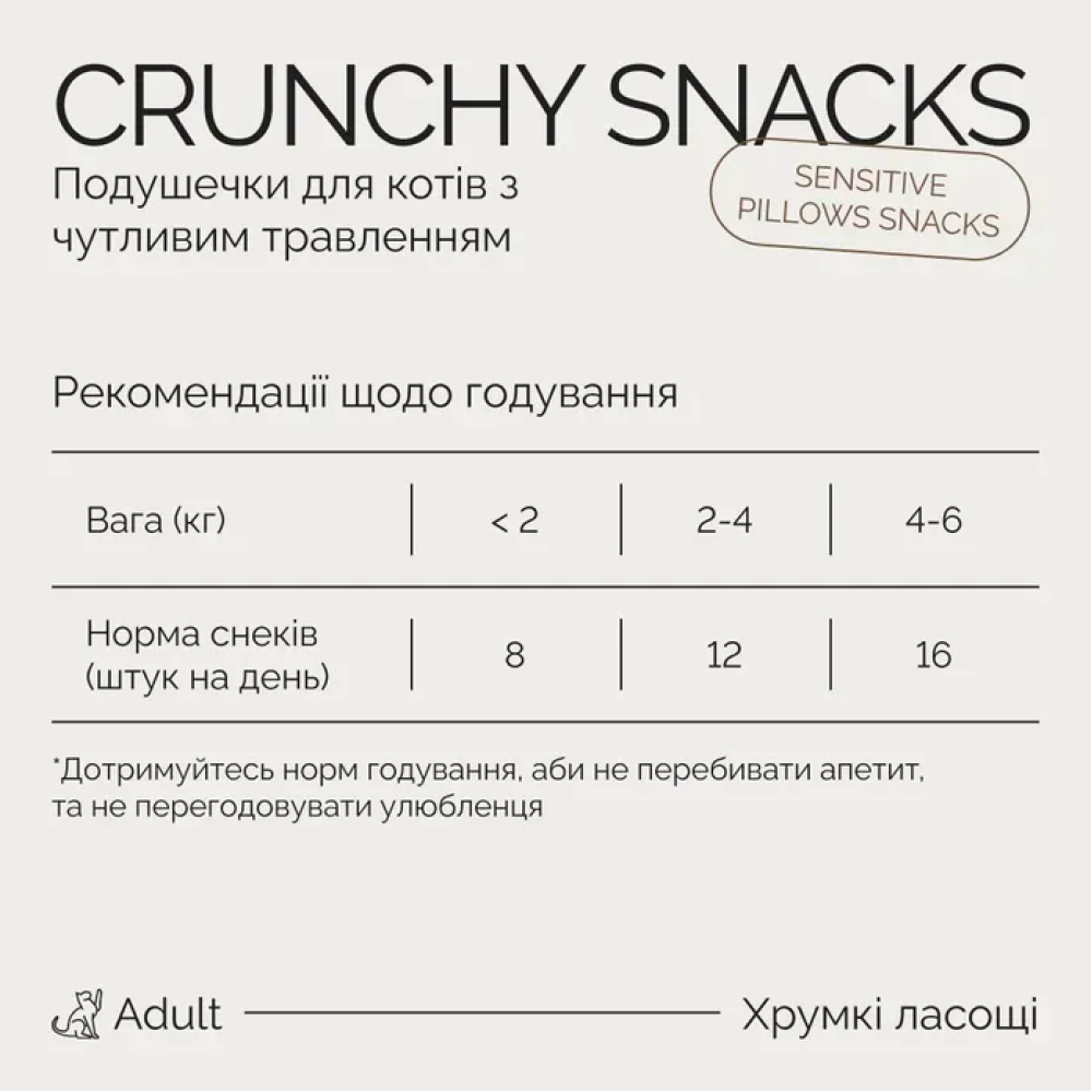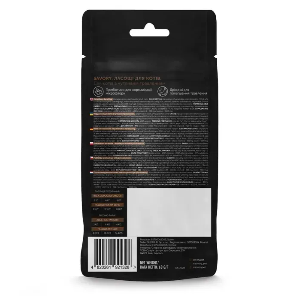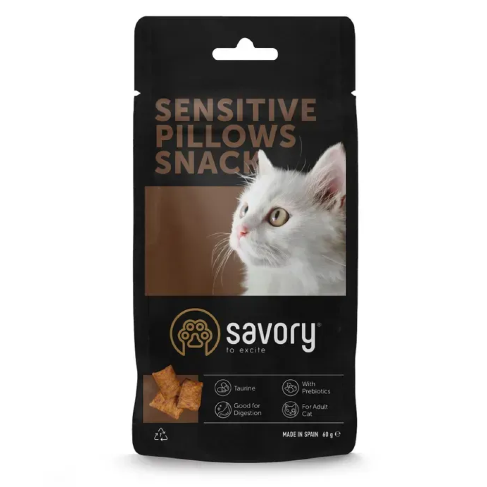 Savory Sensitive Pillows Snack — это вкусные и полезные хрустящие лакомства, созданные специально для котов с чувствительным пищеварением. Они сочетают аппетитный вкус курицы и сбалансированный комплекс витаминов и питательных веществ, помогая поддерживать хорошее самочувствие вашего питомца ежедневно.