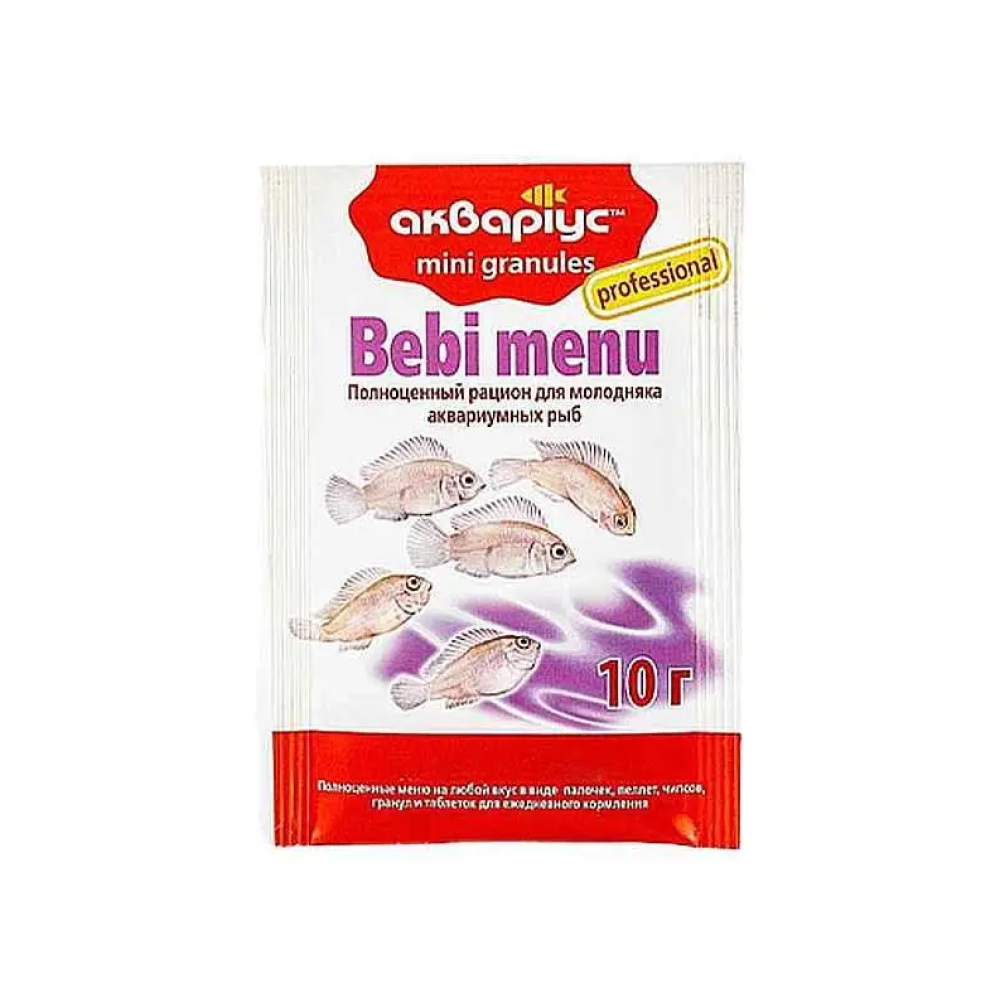 Корм "BEBI MENU", mini granules ( "Бебі меню", міні гранули) - інтенсивний раціон, призначений для щоденного годування молодняка акваріумних риб. Ретельно збалансований за змістом поживних речовин, вітамінів і мінералів, корм забезпечує повноцінну годівлю молодняку риб і не вимагає доповнення раціону іншими видами кормів.
