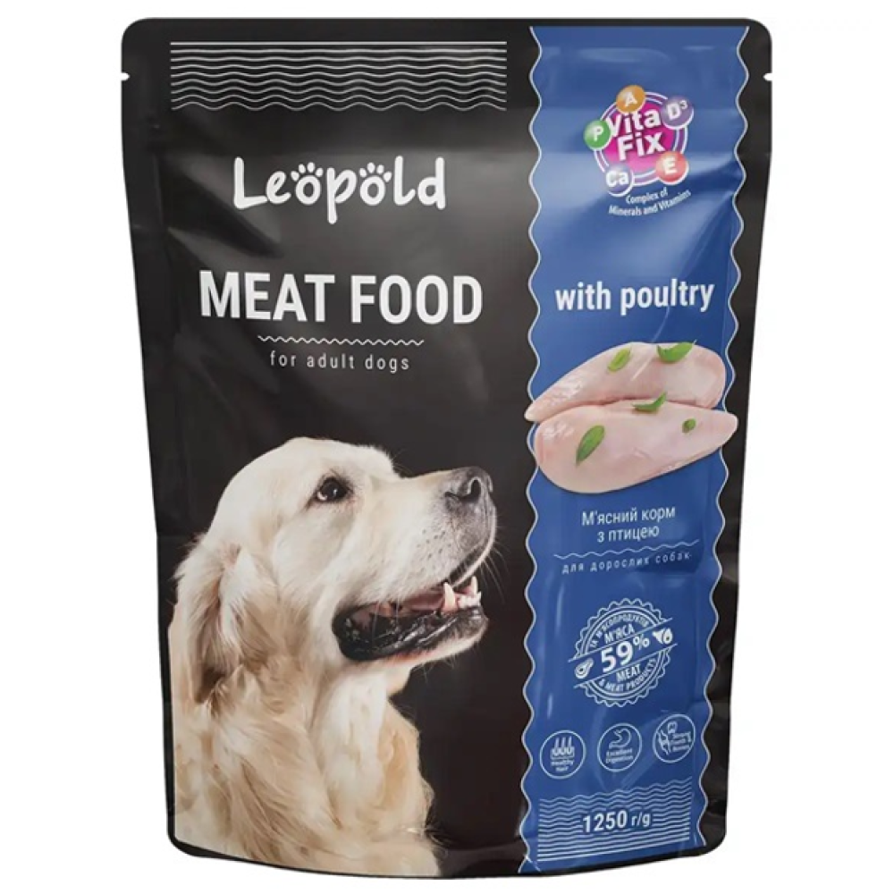 Влажный корм для собак Леопольд на 59% состоит из мяса и мясных продуктов. Корм изготовлен только из натуральных ингредиентов высокого качества.