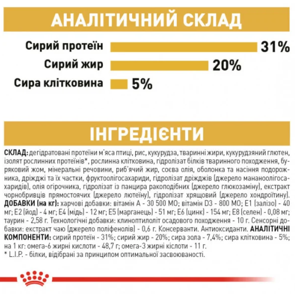 дегидратированной протеины мяса птицы, рис, кукуруза, животные жиры, кукурузный глютен, изолят растительных белков *, растительная клетчатка, гидролизат белков животного происхождения, свекольный жом, минеральные вещества, рыбий жир, соевое масло, оболочка и семена подорожника, дрожжи и их доли, фруктоолiгосахариды, гидролизат дрожжей (источник мананоолигосахаридив), масло огуречника, гидролизат из панциря ракообразных (источник глюкозамина), экстракт бархатцев прямостоячих (источник лютеина), гидролизат хрящевой (источник хондроитина).
