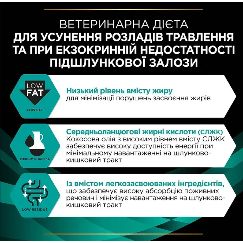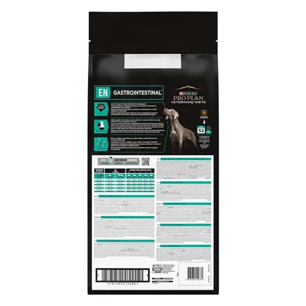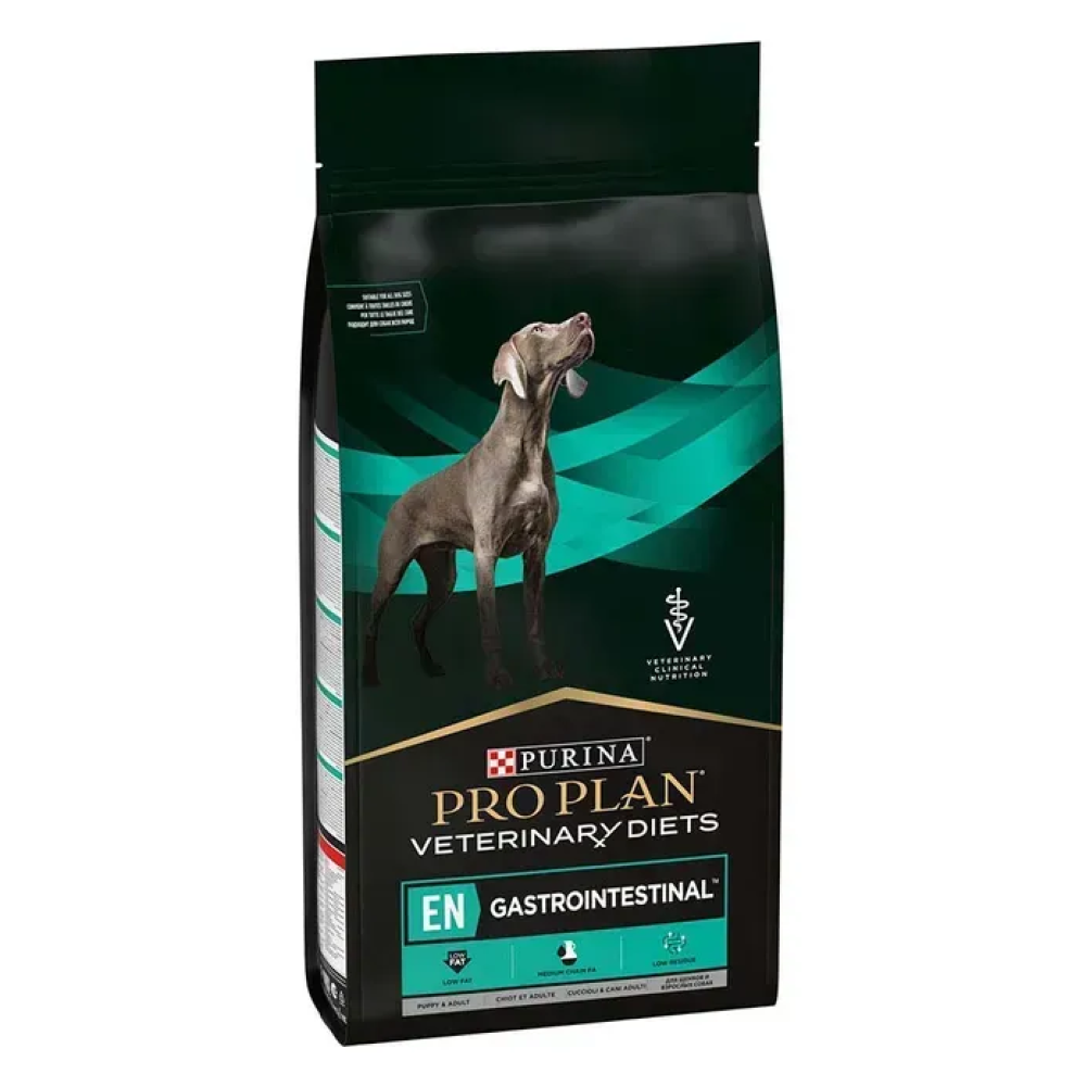 Pro Plan Veterinary Diets EN Gastrointestinal Canine Formula - это полнорационный диетический корм для щенков и взрослых собак для применения при нарушении пищеварения и при экзокринной недостаточности поджелудочной железы. С легкоусвояемыми ингредиентами и низким содержанием жира. Эта диета содержит высокий уровень электролитов и легкоусвояемых ингредиентов. Также может применяться для понижения острых расстройств кишечной абсорбции.