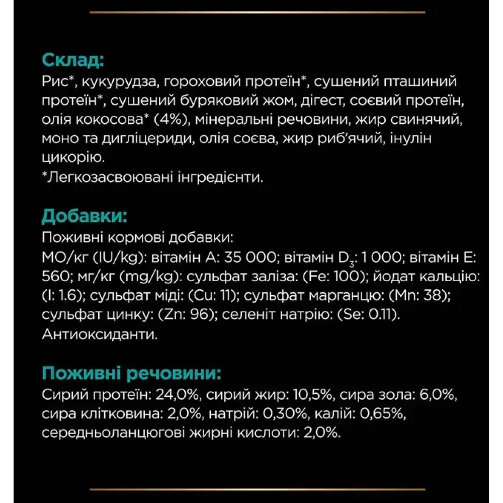 Кукуруза, рис *, кукурузная клейковина *, обезвоженный птичий протеин *, сушеный свекловичный жом, дигест, масло кокосовое * (4%), витамины и минеральные вещества, жир животный, моно- и диглицериды, масло соевое, жир рыбий, инулин, антиоксиданты (бутил гидрооксианизол, пропилгаллат), холин хлорид, метионин, лизин.