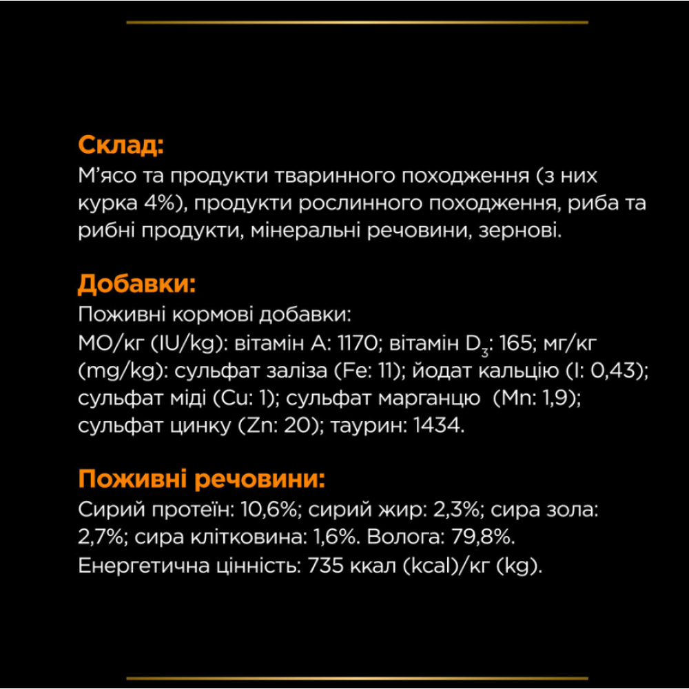 МЕ/кг (IU/kg): витамин A: 1170; витамин D3: 165; мг/кг (мг/кг): сульфат железа (Fe: 11); йодат кальция (I: 0,43); сульфат меди (Cu: 1); сульфат марганца (Mn: 1,9); сульфат цинка (Zn: 20); таурин: 1434.