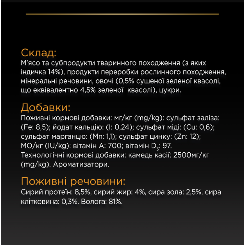 Состав: мясо и субпродукты животного происхождения (из которых индейка 14%), продукты переработки растительного происхождения, минеральные вещества, овощи (0,5% сушеной зеленой фасоли, что эквивалентно 4,5% зеленой фасоли), сахара.