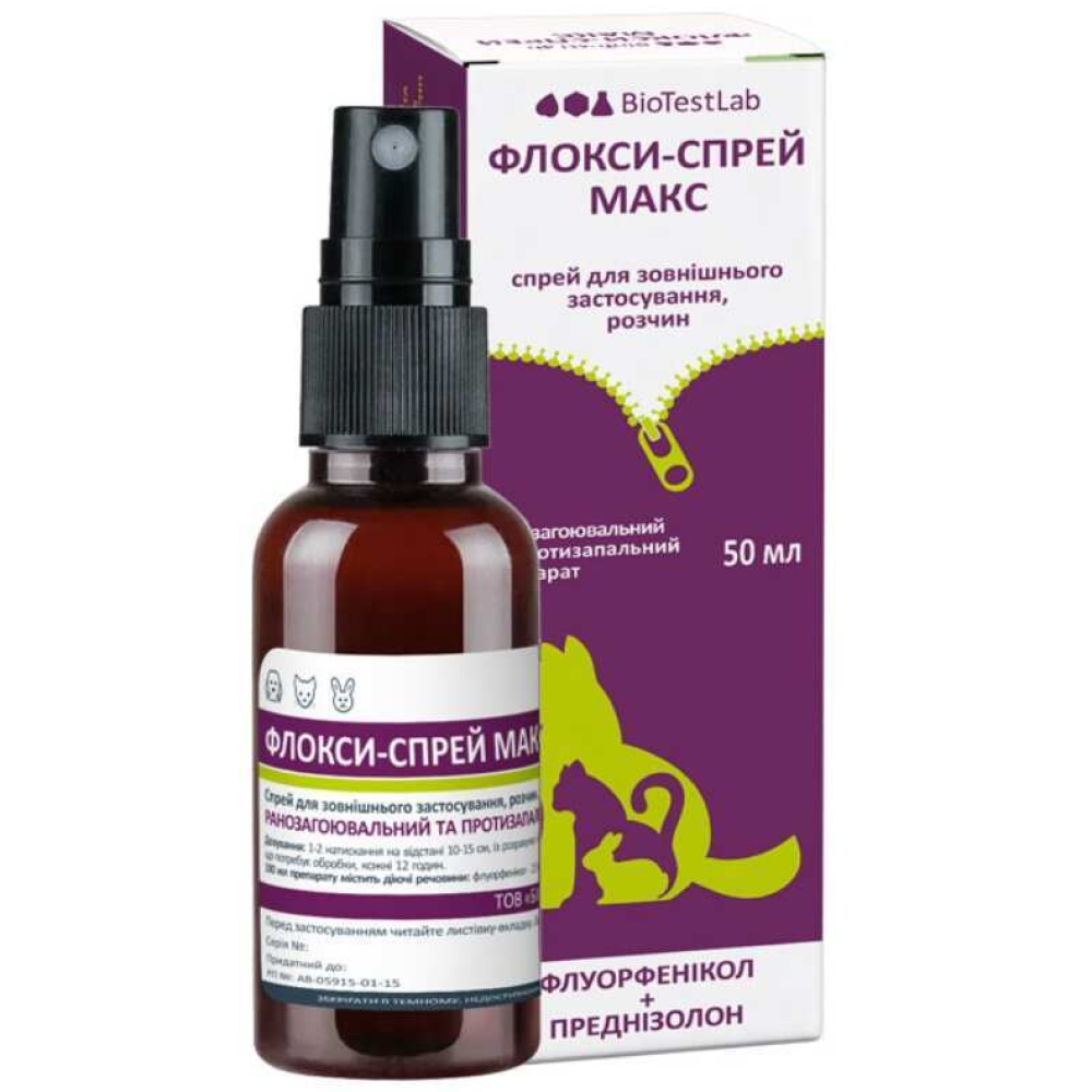 ФЛОКСИ СПРЕЙ МАКС являет собой прозрачную жидкость бесцветную или светло желтого цвета. Обладает противомикробными, противовоспалительными, противоаллергическими и ранозаживляющими свойствами. Применяют для местного лечения дерматитов, экзем, панариций, при укусах, язвах, открытых абсцессах, а также травматических и хирургических ранах(после кастрации).