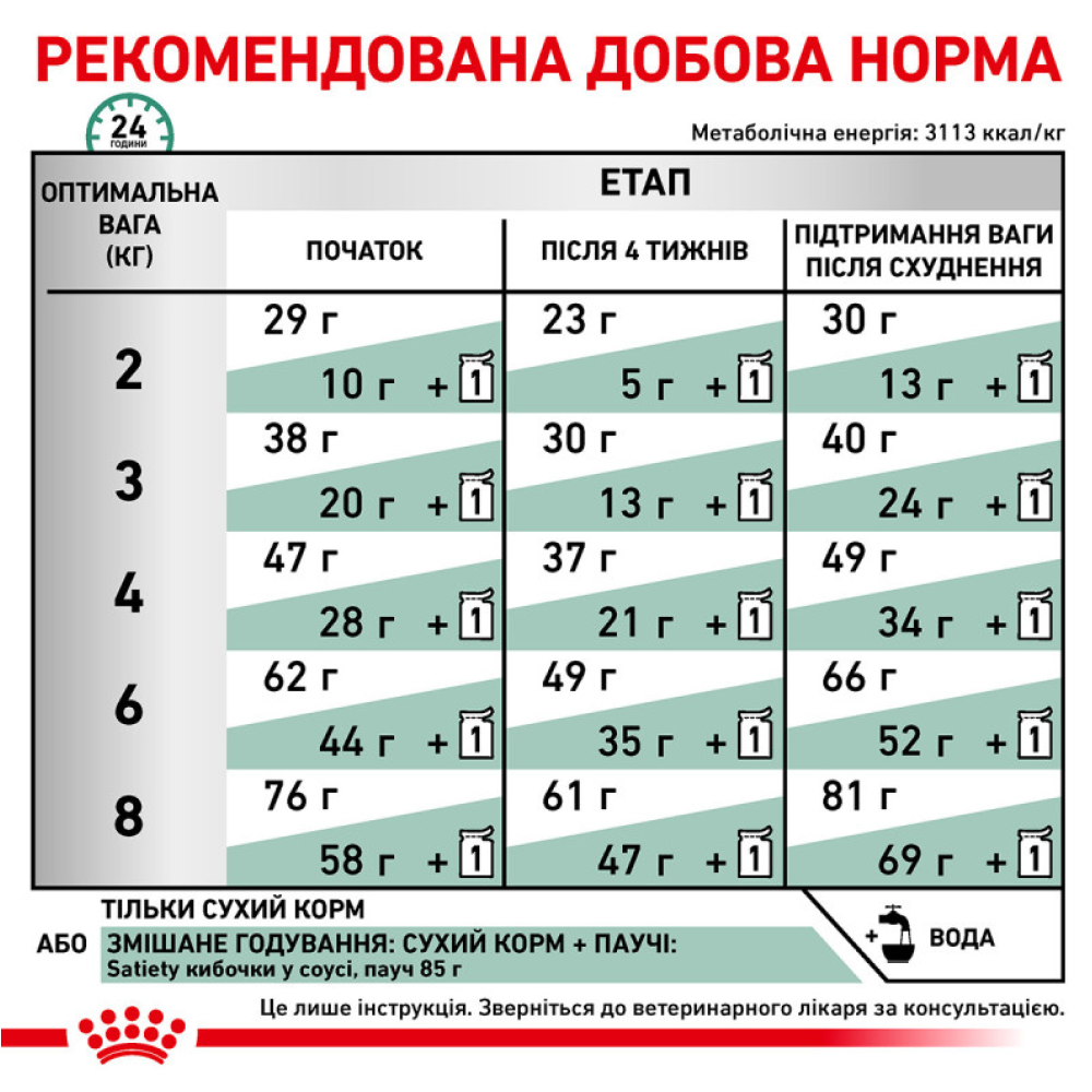 До назначения диеты необходимо определить оптимальный вес тела кота в соответствии с индивидуальными особенностями и стандартами породы. В соответствии с оптимальным весом определяется суточная норма. Суточная норма может быть изменена ветеринарным врачом на основе скорости снижения веса. Оптимальное снижение веса в первые 3 месяца 1-3% в неделю и 0,5-2% в неделю в дальнейшем. Как рассчитывается распределение энергии для поддержания веса после похудения? Энергетические потребности для поддержания веса тела после похудения ниже, чем у кошек, никогда не имевших лишнего веса. Опираясь на современные научные данные (Serisier & al. 2011/Серезье и другие), рацион для поддержания веса после похудения рассчитывается путем увеличения на 33% рациона для снижения веса. Курс употребления сухого корма SATIETY WEIGHT MANAGEMENT: до достижения оптимального веса животного. Помните, что животному необходимо обеспечить постоянный доступ к питьевой воде