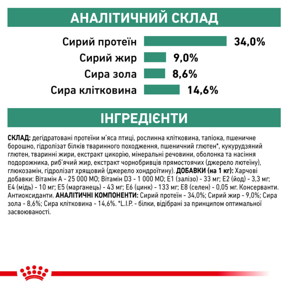 дегидратированные протеины мяса птицы, растительная клетчатка, тапиока, пшеничная мука, гидролизат белков животного происхождения, пшеничный глютен*, кукурузный глютен, животные жиры, экстракт цикория, минеральные вещества, оболочка и семена подорожника, рыбий жир, лютеина), глюкозамин, гидролизат хрящевой (источник хондроитина).