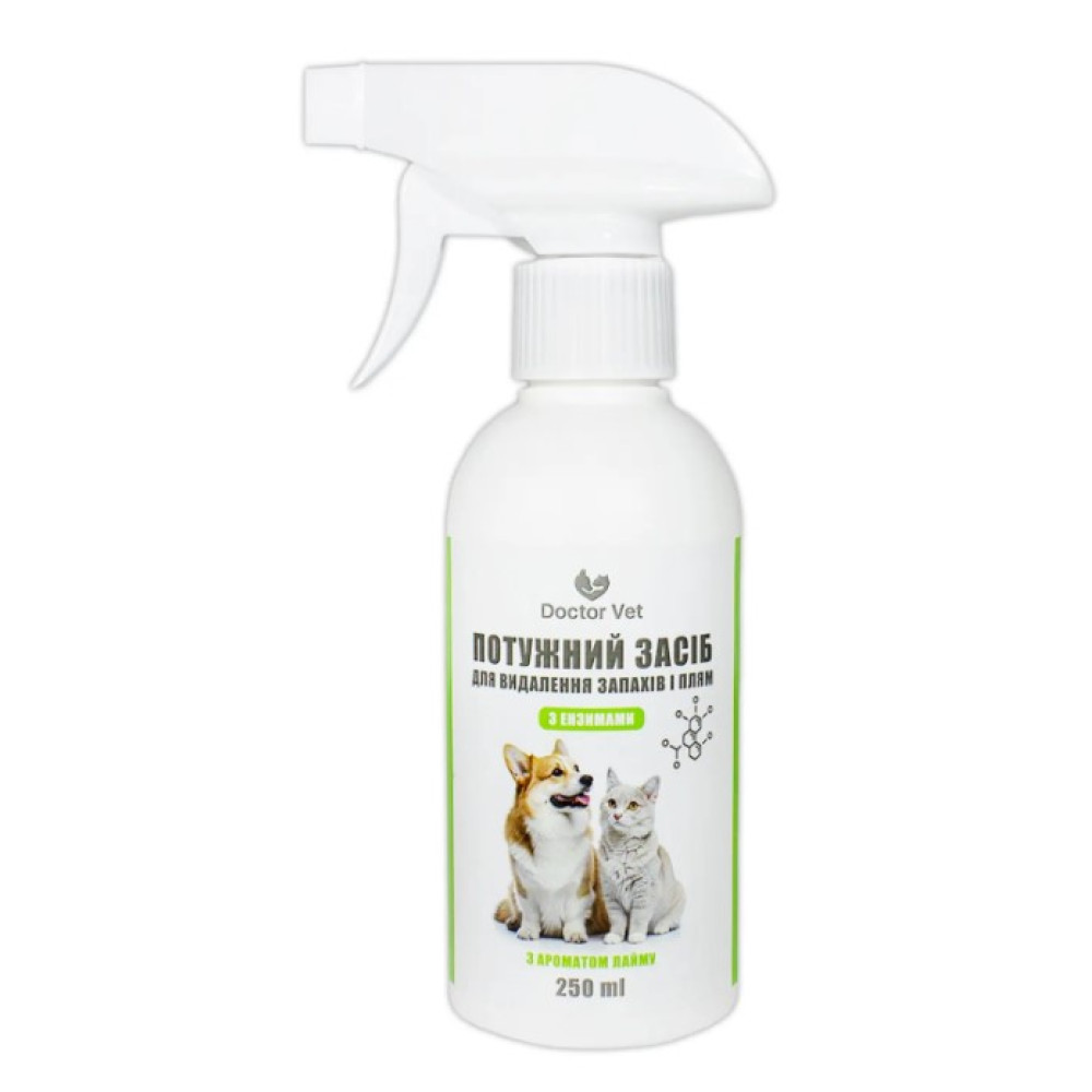 Doctor Vet Мощное средство для удаления запахов и пятен с энзимами, аромат лайма, 500 мл - это эффективное и безопасное средство нового поколения, разработанное специально для устранения неприятных запахов и пятен биологического происхождения (моча, рвота, кал, слюна, кровь и т.д.) на различных поверхностях; Благодаря уникальной формуле с тремя энзимами, средство глубоко проникает в волокна тканей и на клеточном уровне нейтрализует источник запаха, не маскируя его. Не содержит хлора, фосфатов, агрессивной химии и красителей. Подходит для использования в местах, где находятся домашние животные;