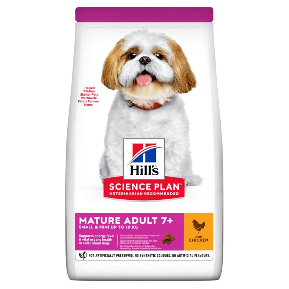 Hill's Science Plan Mature Adult 7+ Small&Mini – полнорационное питание для взрослых собак в возрасте от 7 лет и весом до 10 кг, обеспечивающее здоровое пищеварение и поддержание подвижности.