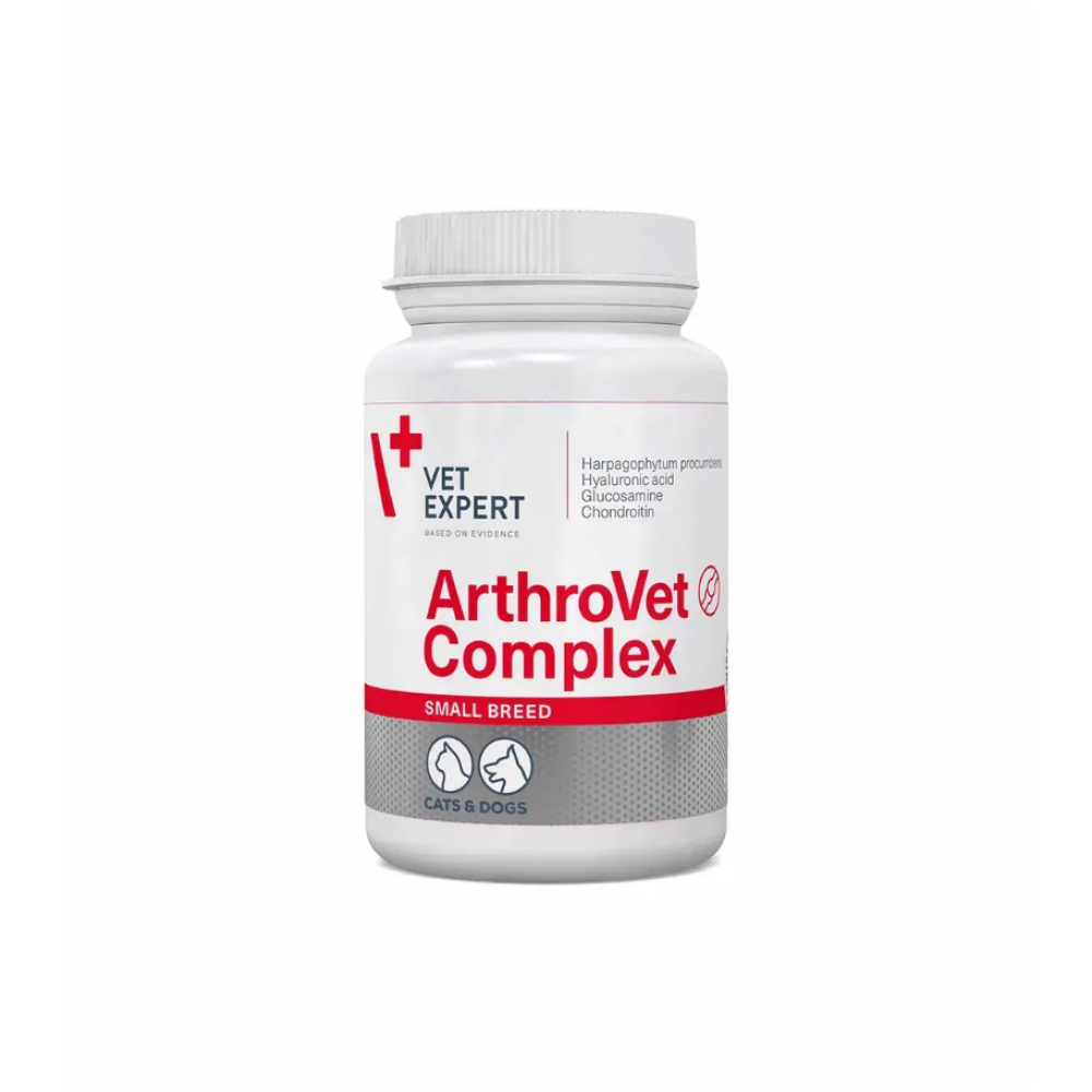 Vet Expert ArthroVet Complex Small breed&cats (Вет Експерт Артровет Комплекс для котів і собак малих порід) – харчова добавка для котів і собак малих порід із порушеннями функції хрящів і суглобів. Підходить для молодих, дорослих і зрілого віку тварин, особливо при ортопедичних травмах, перед ортопедичними процедурами та у період одужання.