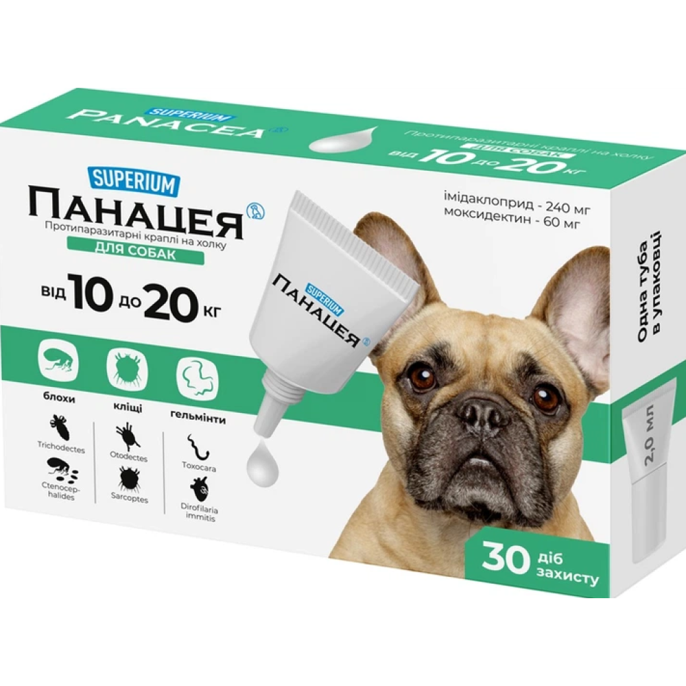 Суперіум Панацея (Superium Panacea) – протипаразитарні краплі на холку для собак (розчин для зовнішнього застосування, точкового нанесення).