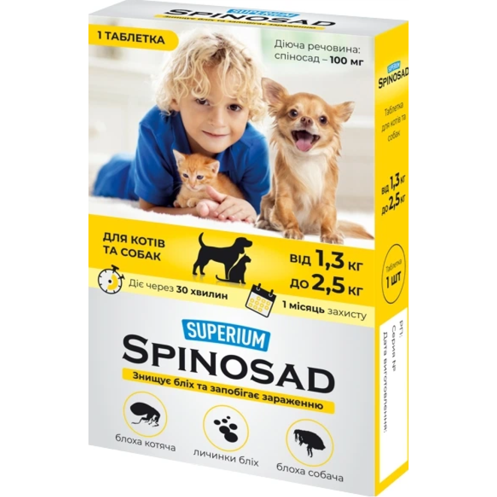 Superium Spinosad — перша в Україні таблетка від бліх природного походження. Препарат підходить для котів і собак вагою від 1,3 кг та віком від 4 місяців. Захищає улюбленця від ектопаразитів впродовж місяця.