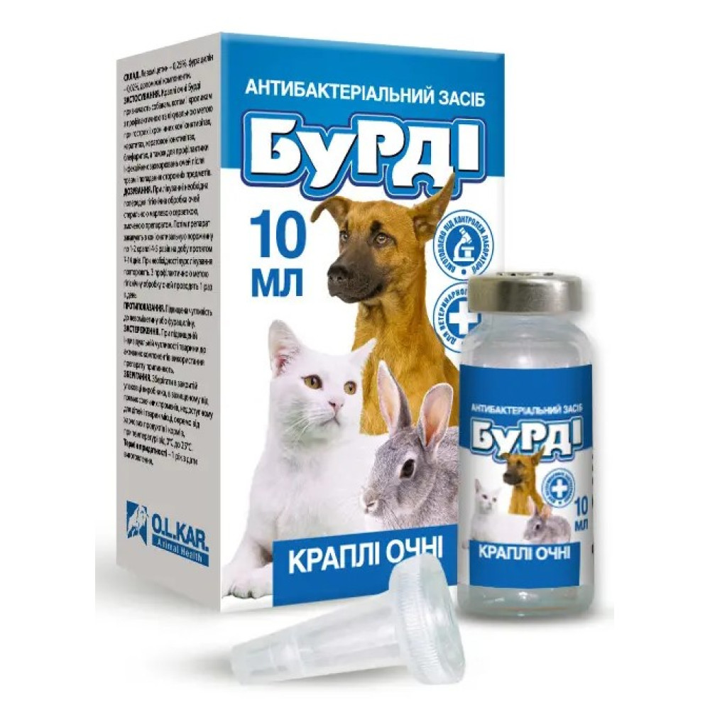 Краплі очні Бурді призначають собакам, котам і кроликам з профілактичною та лікувальною метою при гострих і хронічних кон’юнктивітах, кератитах, кератоконъюнктивітах, блефаритах, а також для профілактики інфекційних захворювань очей після травм і попадання сторонніх предметів.