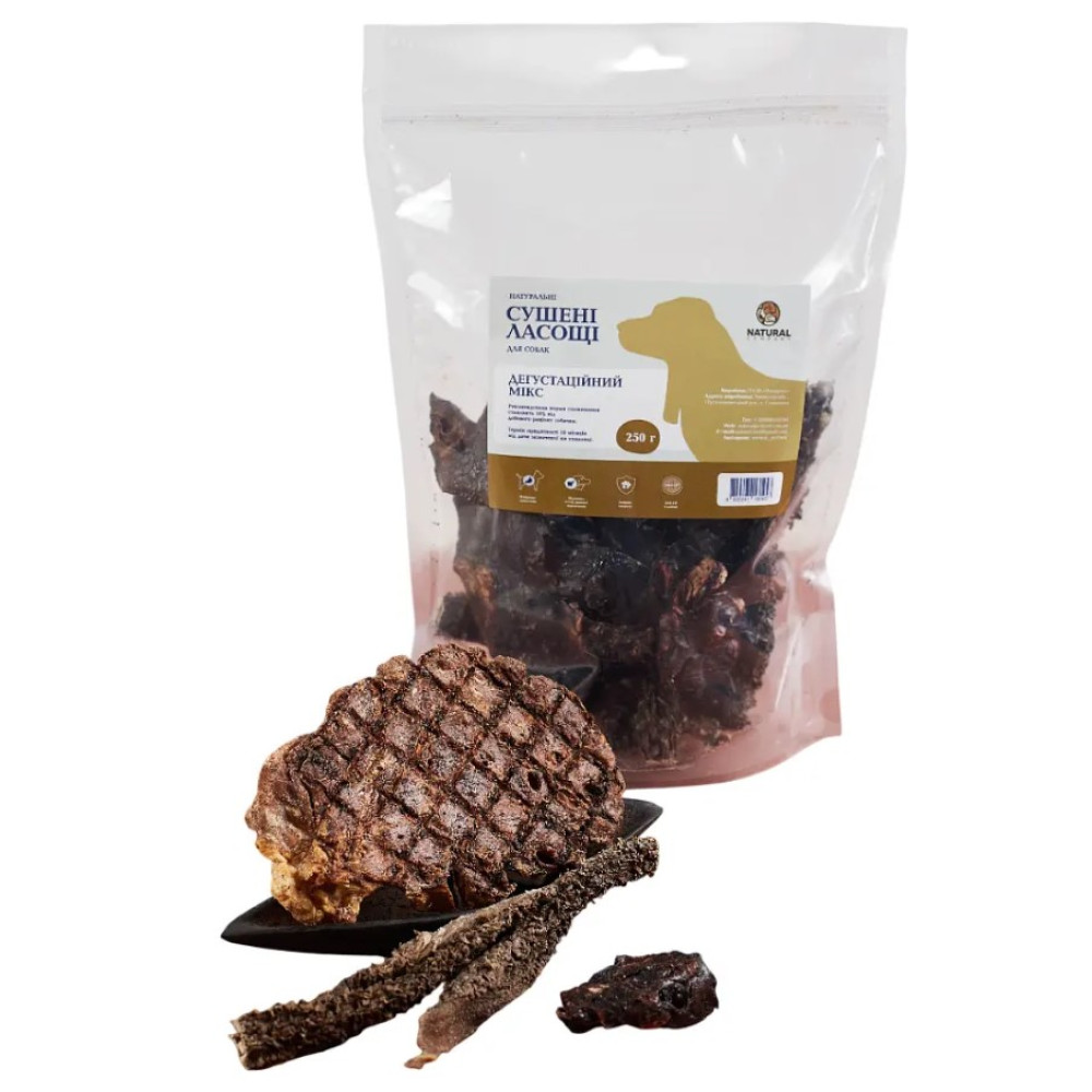 Ласощі для собак Natural чудово підходять для собачок з чутливою травною системою. Натуральні жувальні ласощі у вигляді міксу з сушених яловичих субпродуктів (вим'я, рубець, печінка та легені) для дорослих собак і цуценят старше 3 місяців. Корисне частування має яскраво виражений і привабливий для собак запах, а також насичує організм улюбленця цінним білком, мінералами, вітамінами та іншими важливими нутрієнтами, необхідними для підтримки здоров'я шлунково-кишкового тракту, суглобів та кісток, серцево-судинної та нервової систем.