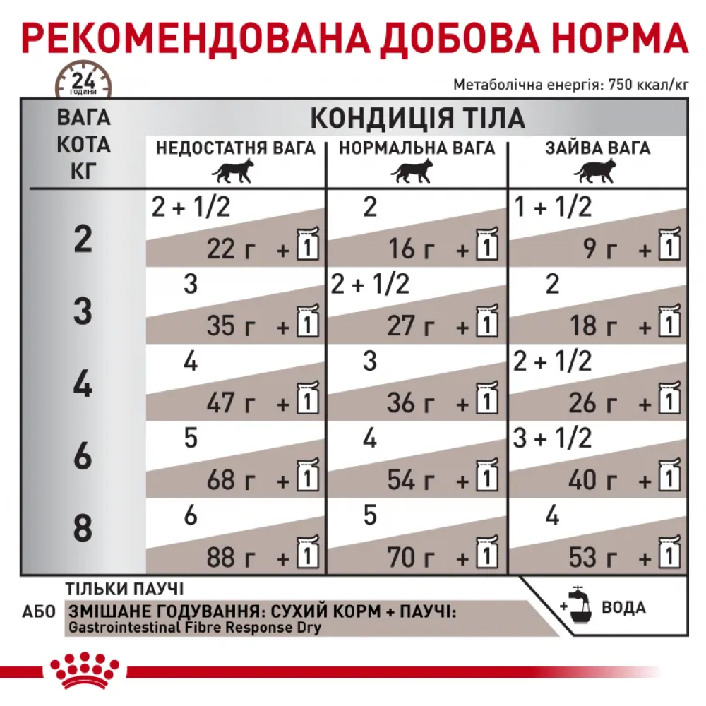 Рекомендації: перед початком використання корму рекомендована консультація ветеринарного лікаря. Початковий курс використання корму ГАСТРОІНТЕСТІНАЛ ФАЙБЕР РЕСПОНС (шматочки в соусі): до 12 тижнів і все життя у разі хронічної недостатності підшлункової залози.