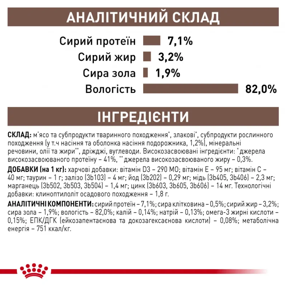 Склад: м’ясо та субпродукти тваринного походження*, злакові*, субпродукти рослинного походження (у т.ч насіння та оболонка насіння подорожника, 1,2%), мінеральні речовини, олії та жири**, дріжджі, вуглеводи. Високозасвоювані інгредієнти: *джерела високозасвоюваного протеїну - 41%, **джерела високозасвоюваного жиру - 0,3%.