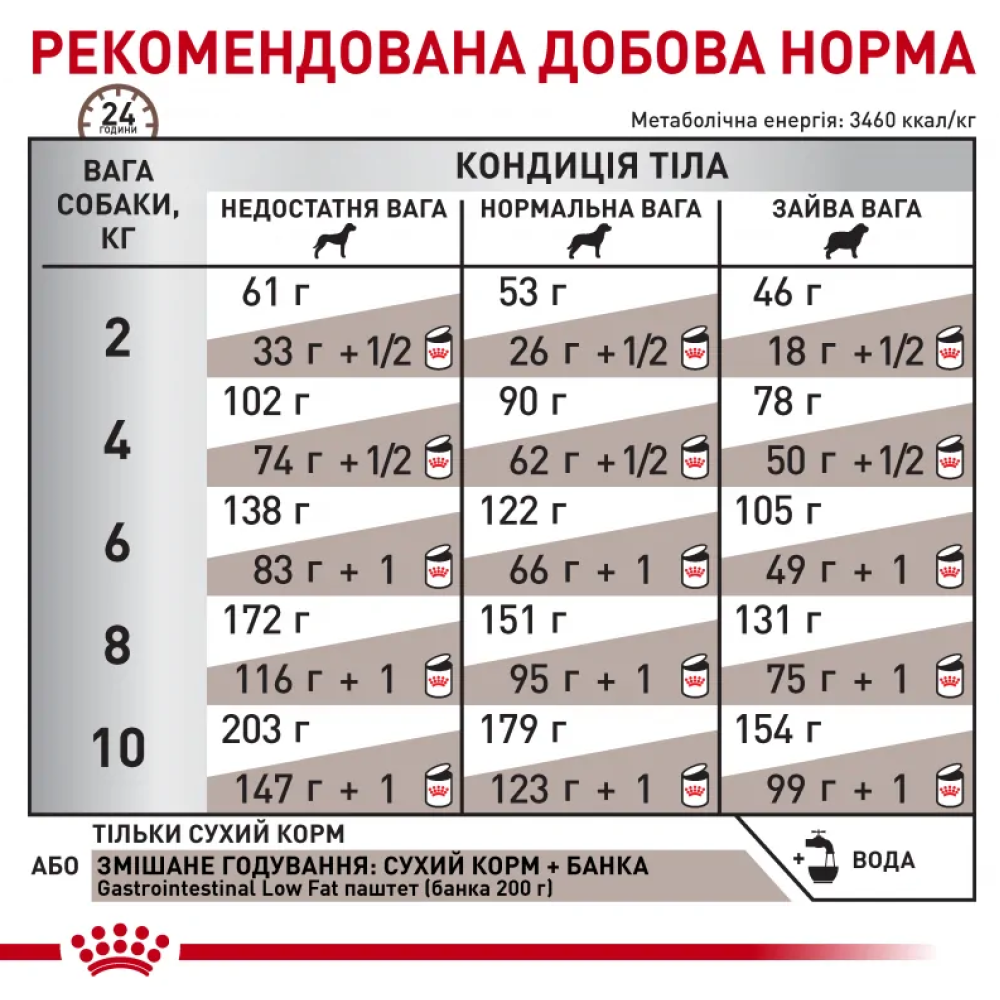 Тривалість годування залежить від тяжкості клінічних ознак. Рекомендовано розділити добову норму корму на декілька прийомів. Перед початком та/або продовженням використання дієти потрібна консультація ветеринарного лікаря. Початковий курс вживання паштету Gastrointestinal Low Fat: до 2 місяців у випадку гіперліпідемії.