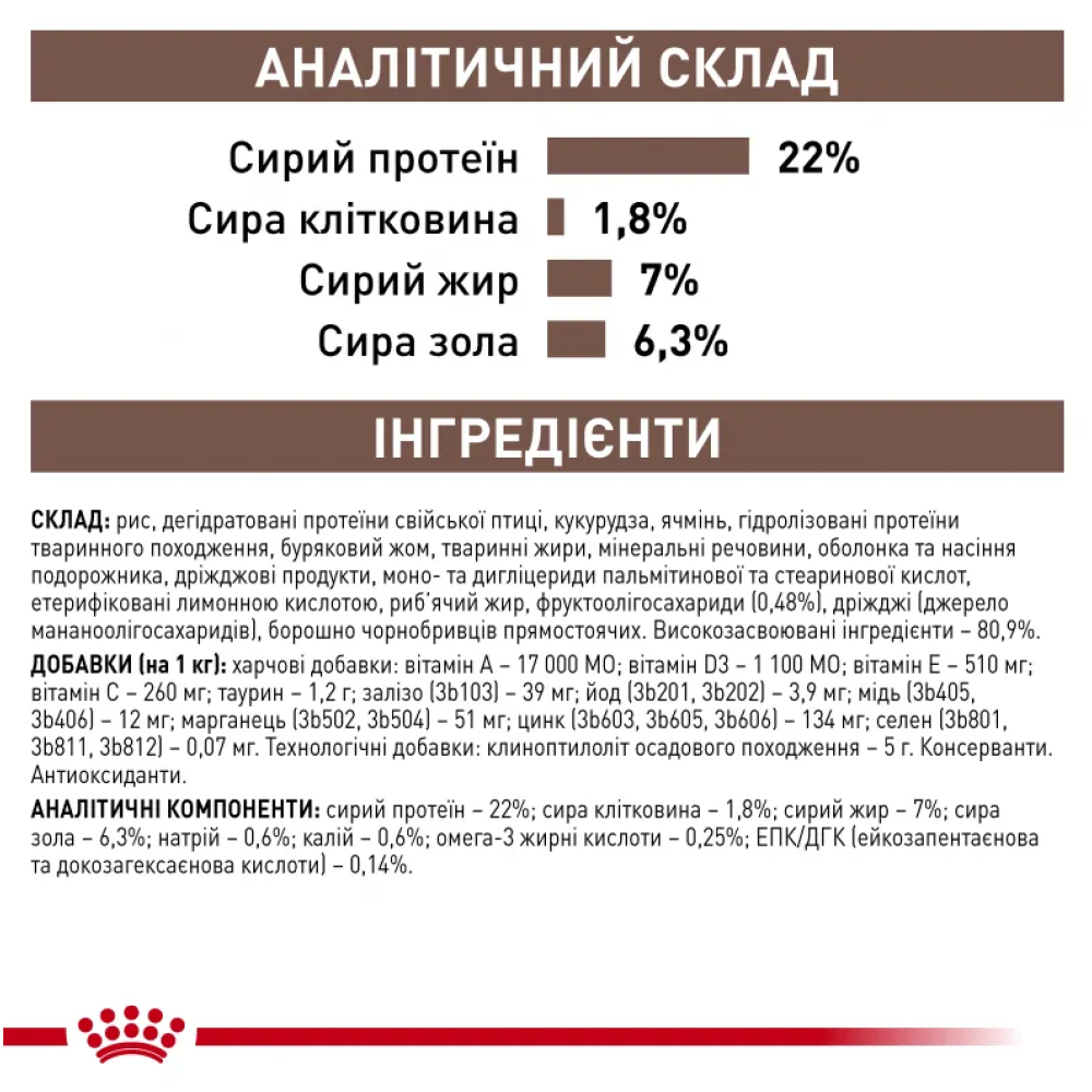 сирий протеїн - 22,0%; сирий жир - 7,0%; сира зола - 6,2%; сира клітковина - 1,8%; незамінні жирні кислоти - 1,25%; Oмега-3 жирні кислоти - 0,3%; ЕПК/ДГК - 0,13%.