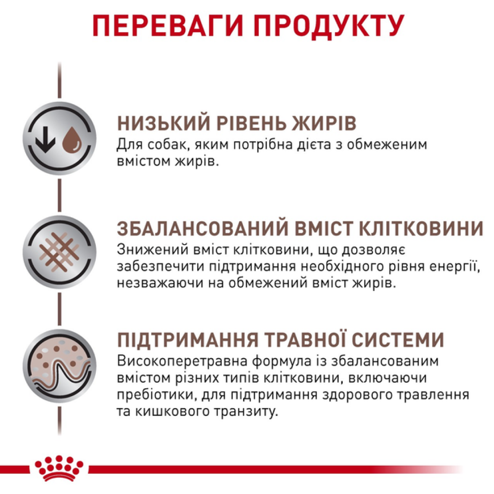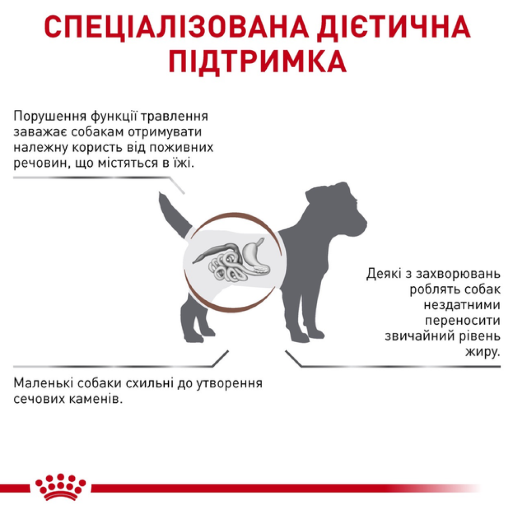 Корм сухий повнораціонний дієтичний для дорослих собак дрібних порід GASTROINTESTINAL LOW FAT SMALL DOG (ГАСТРОІНТЕСТІНАЛ ЛОУ ФЕТ СМОЛ ДОГ) з порушеннями травлення, що сприяє регуляції метаболізму ліпідів при гіперліпідемії. Цей продукт містить легкозасвоювані інгредієнти та малу кількість жирів. Цей продукт містить малу кількість жирів і високий рівень незамінних жирних кислот.