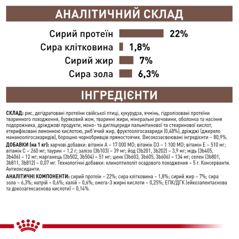 - ВМІСТ ПОЖИВНИХ РЕЧОВИН: Білки: 22,0 % - Жири: 7,0 % - Зола: 6,3 % - Клітковина харчова: 2,0 % - ЕПК/ДГК: 0,15 %.