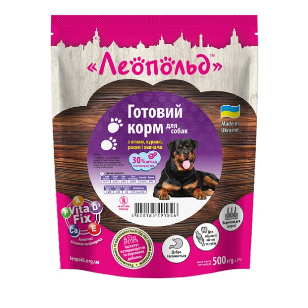 Консерви для собак Леопольд Готовий корм з ягнятинкою, куркою, рисом і овочами - це повноцінне харчування, до складу якого входять лише натуральні продукти, а також багато корисних мінералів і вітамінів, що дозволяють Вашому улюбленцю бути здоровим і задоволеним.
