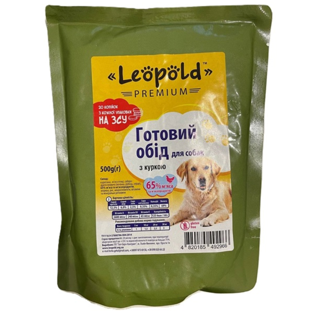 Натуральний корм для собак від українського виробника Леопольд у консервованому вигляді не містить барвників, ароматизаторів, сої, консервантів, підсилювачів смаку.