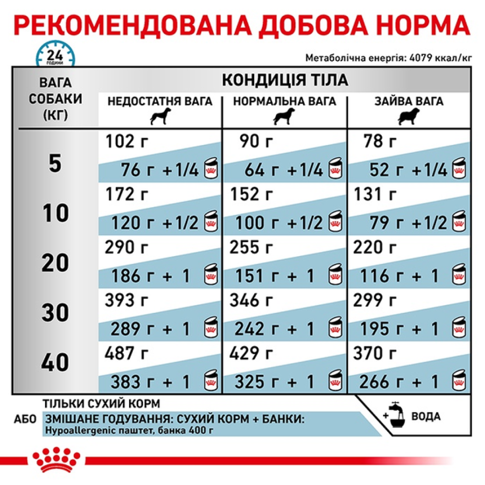 Див. таблицю. Стежте за тим, щоб у вашої тварини завжди була свіжа вода. Код партії, реєстраційний номер заводу та дата закінчення строку придатності зазначені на упаковці. Зберігати у сухому прохолодному мiсці.