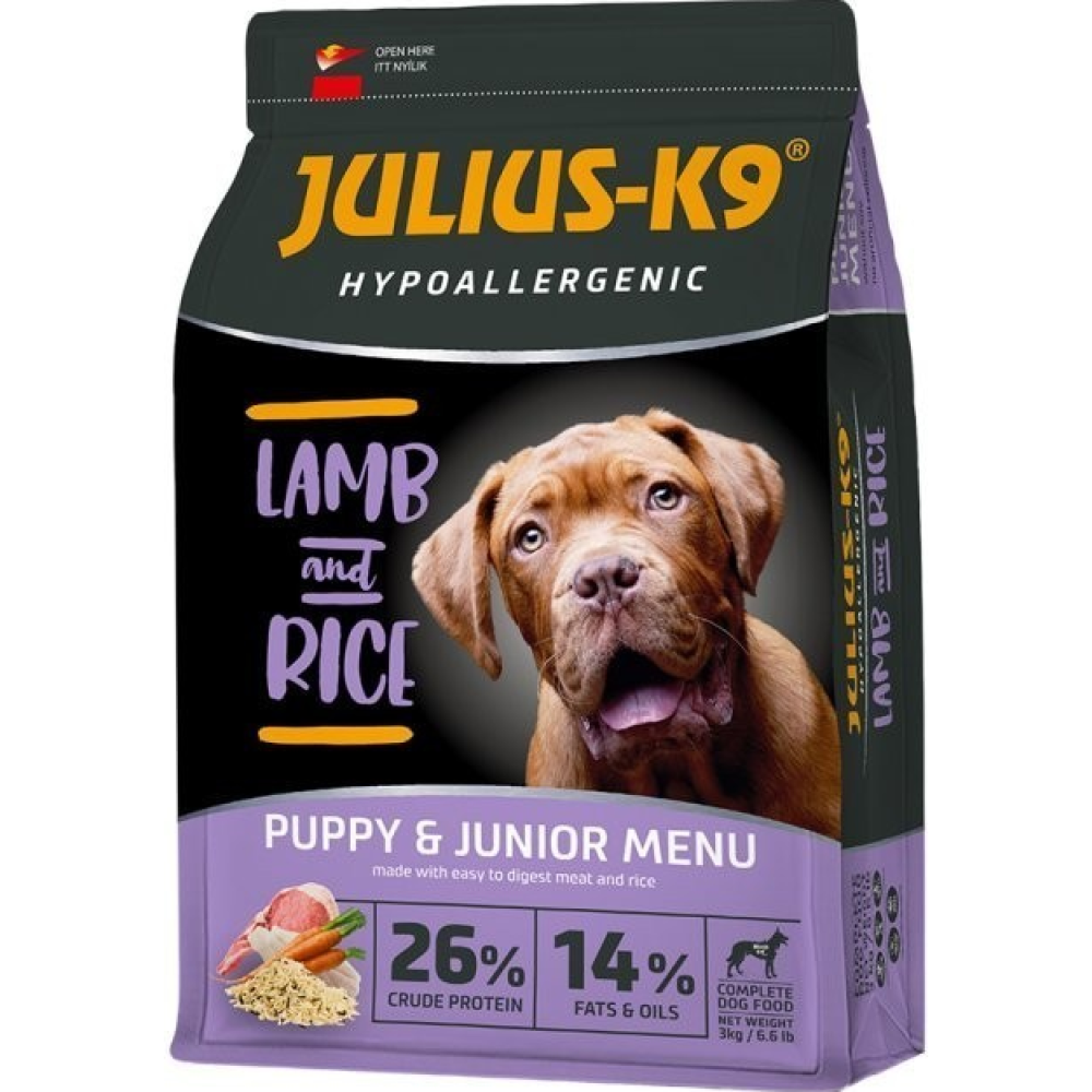 JULIUS-K9 High Premium Lamb & Rice для цуценят виготовлений з ягняти, гіпоалергенного джерела м'яса, який підходить для собак з алергією на курку. Баранина також багата на незамінні амінокислоти, вітаміни і мінерали, які підтримують розвиток м'язів і підтримують енергію. Додатковий коктейль з овочів допомагає впоратися із запаленням та болем у суглобах, містить антиоксиданти та підтримує роботу травного тракту.