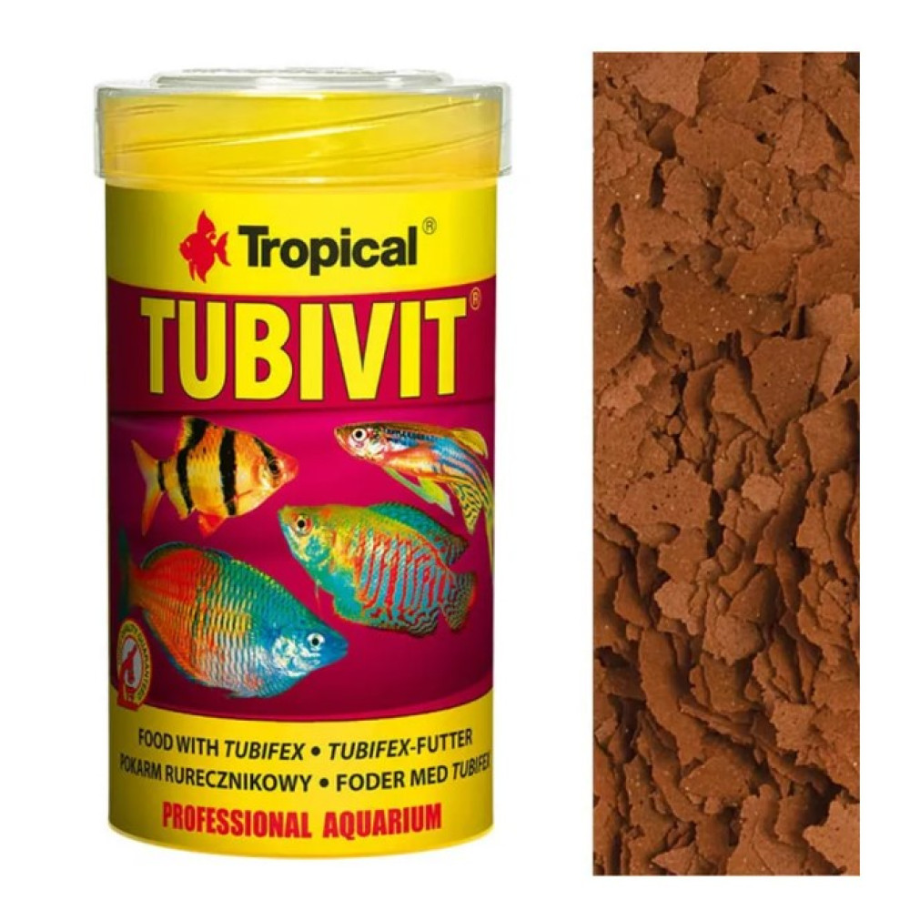 Tropical Tubivit - високобілковий корм у пластівцях високої якості з додаванням трубочника та мотиля. Tropical Tubivit ідеально підходить для щоденного годування рибок, дієта яких рясніє водними безхребетними, такими як личинки комарів; Білковий корм для рибок Tropical Tubivit містить у своєму складі сировину найвищої якості, зокрема спеціально очищений і підготовлений трубочник (Tubifex) і мотиль, завдяки цьому забезпечуються високі смакові якості. Регулярне годування кормом забезпечує ваших акваріумних риб чудовою кондицією, здоров'ям і сильним імунітетом;
