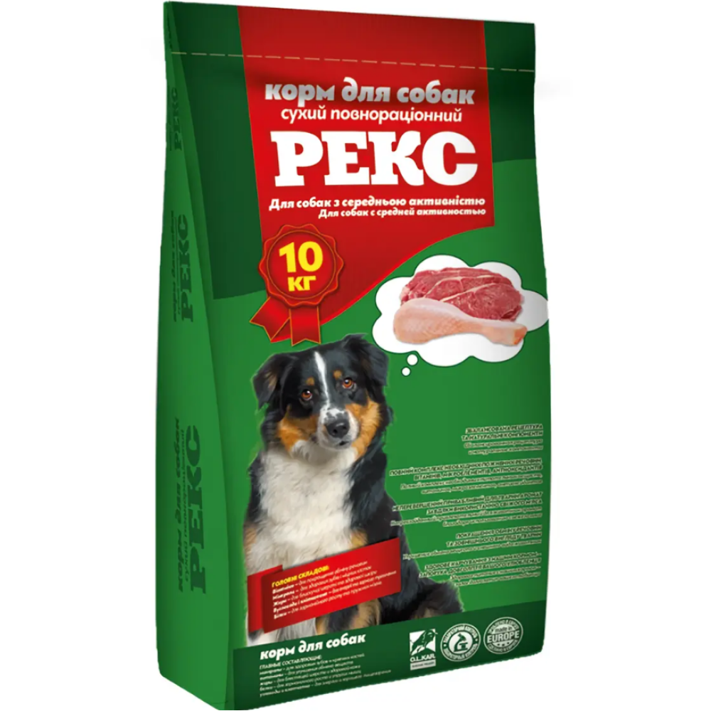 Корм виготовлено на найсучаснішому зарубіжному обладнанні, з використанням високоякісної сертифікованої сировини, ухвалений провідними ветеринарними фахівцями. «Корм Рекс» є улюбленим кормом для собак, тому що має неперевершений привабливий для тварин аромат без застосування штучних ароматизаторів. В його складі міститься протеїн, вітаміни та мікроелементи для доброго засвоєння, активізації обміну речовин, стану шкіри та волосяного покриву, кісток, загального здоров’я тварин.