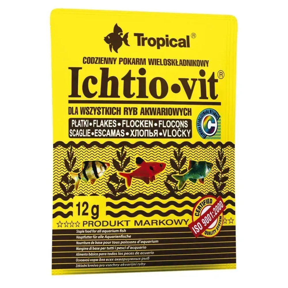 Ichtio-Vit - це багатокомпонентний корм у вигляді пластівців, призначений для щоденного годування всеїдних акваріумних риб. Незамінний в загальних акваріумах з багатовидовим заселенням. Завдяки оптимально збалансованому складу та добавці необхідних вітамінів і мікроелементів забезпечує правильний ріст й розвиток риб. Стійкість риб до захворювань підвищує стабілізований вітамін С, а добавка цеоліту сприятливо впливає на травну систему і виведення токсинів з організму риб.