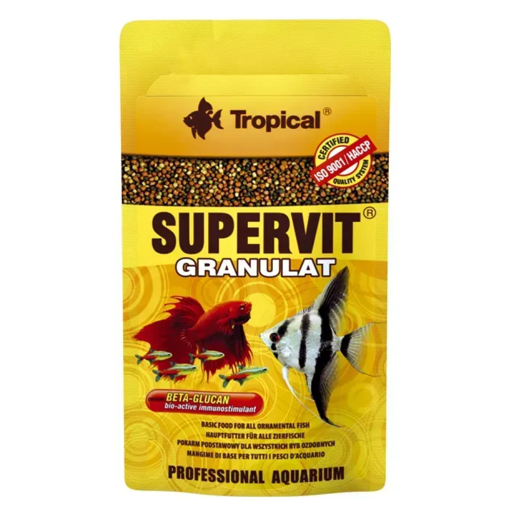 Supervit Granulat є повноцінним багатокомпонентним гранульованим кормом найвищої якості, призначеним для щоденного годування усіх акваріумних риб. Натуральний імуностимулятор бета-1,3/1,6-глюкан і стабілізований вітамін С, що містяться в кормі, ефективно зміцнюють імунологічну систему риб, захищаючи їх від інфекцій. Клітковина і хітин регулюють процес травлення і виділення, каротиноїди інтенсифікують забарвлення, а лецитин підвищує життєздатність і сприяє розмноженню. Добавка цеоліту сприятливо впливає на травну систему і виведення токсинів з організму риб.