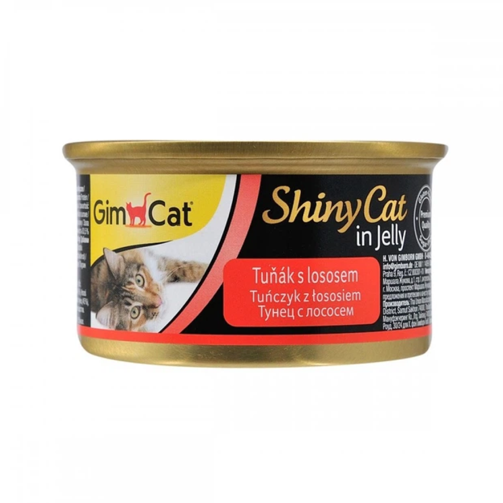 Консерви для котів Shiny Cat тунець і лосось – делікатесний вологий корм, готовий до споживання. Виготовлений з високоякісного м’яса тунця та лосося. Не містить штучних барвників, підсилювачів смаку, консервантів і ГМО.