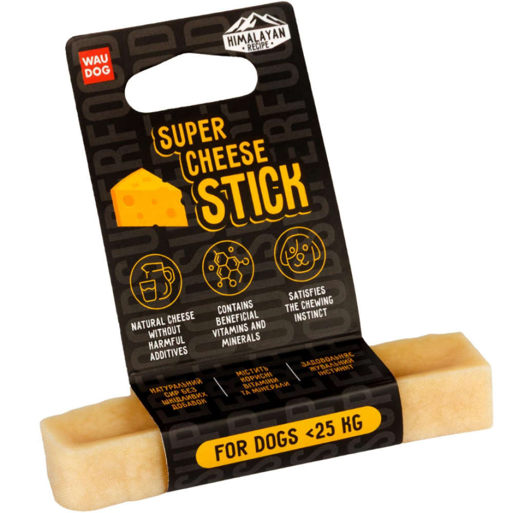 WAUDOG Superfood Сирна паличка — це білкові ласощі, виготовлені з гімалайського сиру. Завдяки щільній текстурі палички забезпечують тривале жування, під час якого собака отримує не лише задоволення, а й користь. Таке жування допомагає зняти стрес, очистити зуби і задовольнити природну потребу гризти.