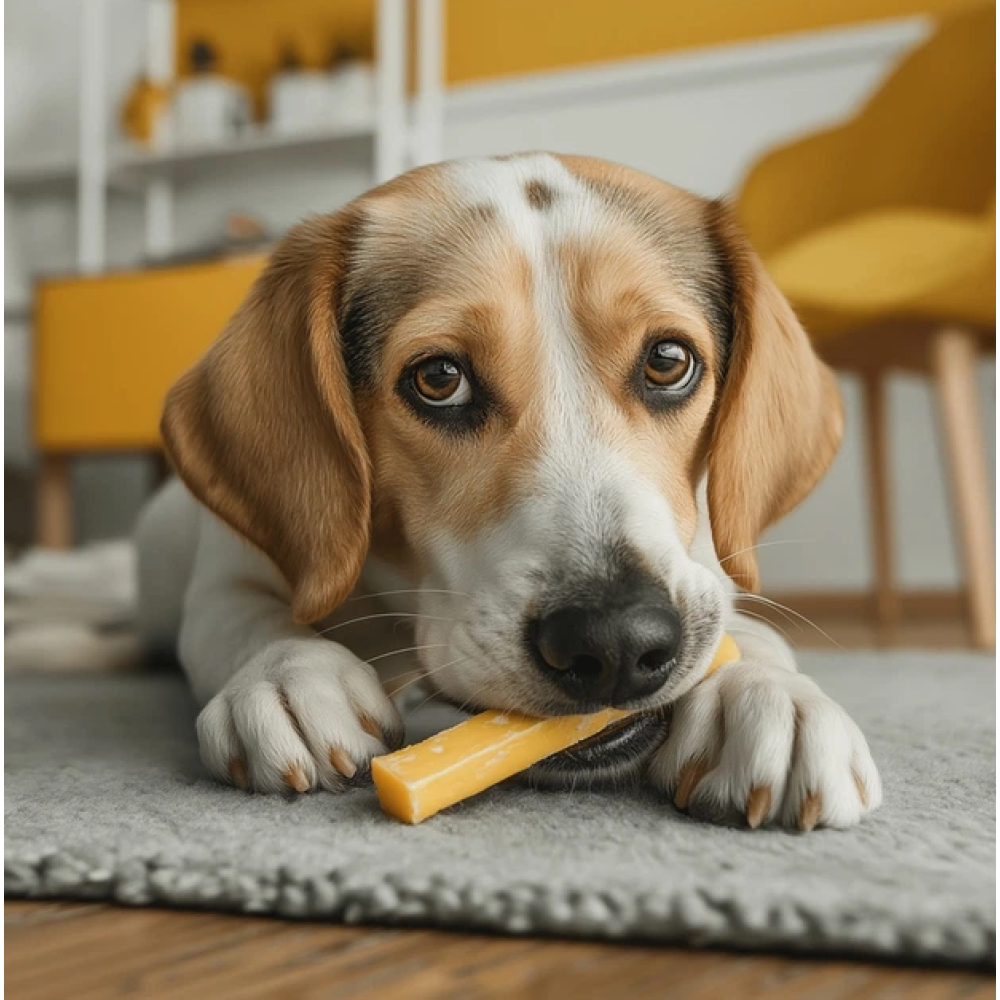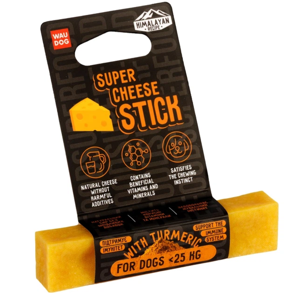 WAUDOG Superfood Сирна паличка з куркумою — це білкові ласощі, виготовлені з гімалайського сиру. Завдяки щільній текстурі палички забезпечують тривале жування, під час якого собака отримує не лише задоволення, а й користь. Таке жування допомагає зняти стрес, очистити зуби і задовольнити природну потребу гризти.