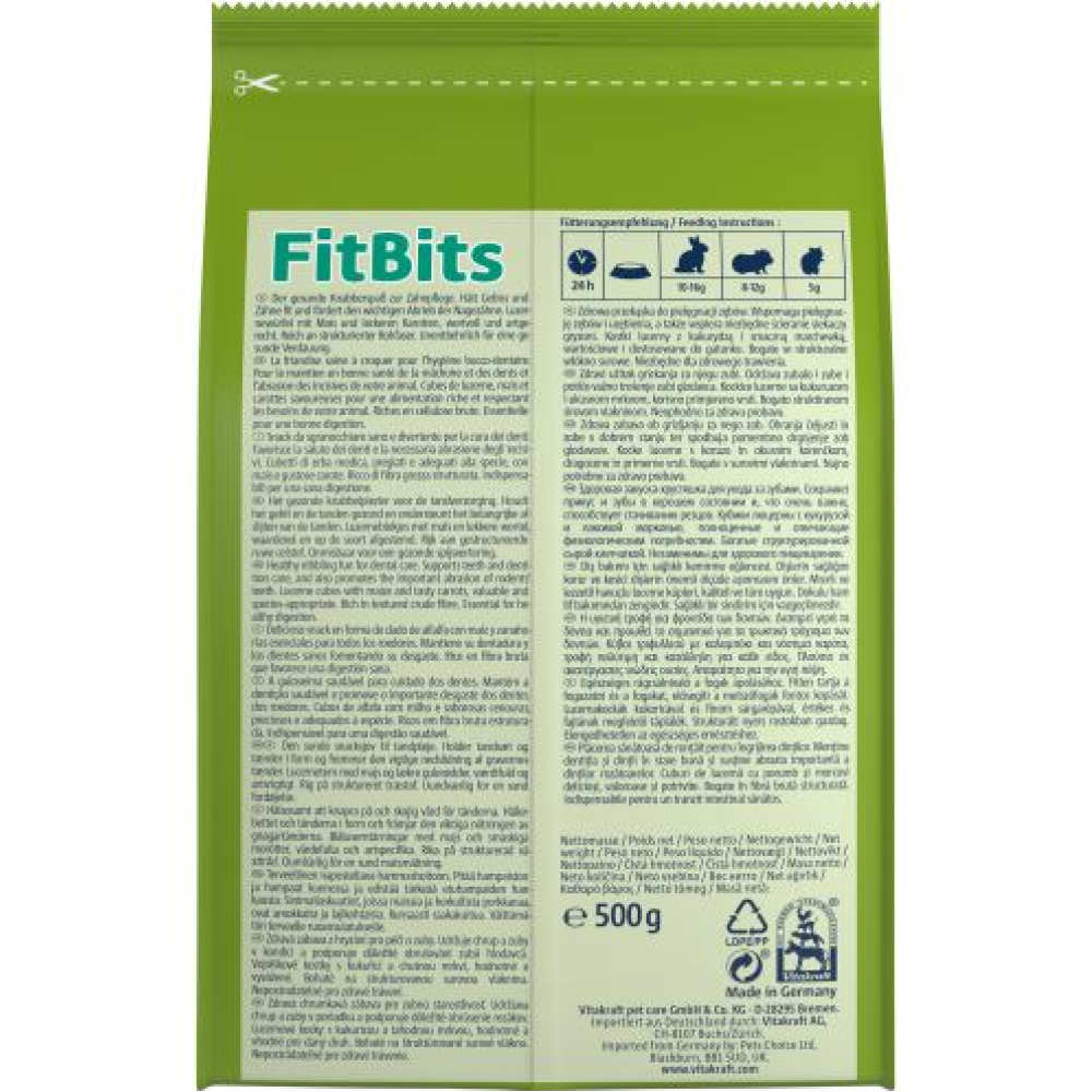 Ласощі для зточування зубів Vitakraft Fit Bits підходить для всіх видів гризунів. До складу входить смачна люцерна, корисна морква і кукурудза, яка містить велику кількість сирої клітковини. Ці компоненти не тільки сприяють поліпшенню здоров'я гризуна, але і допомагають сточувати постійно зростаючі зуби. Не містять цукру, штучних барвників і ароматизаторів.