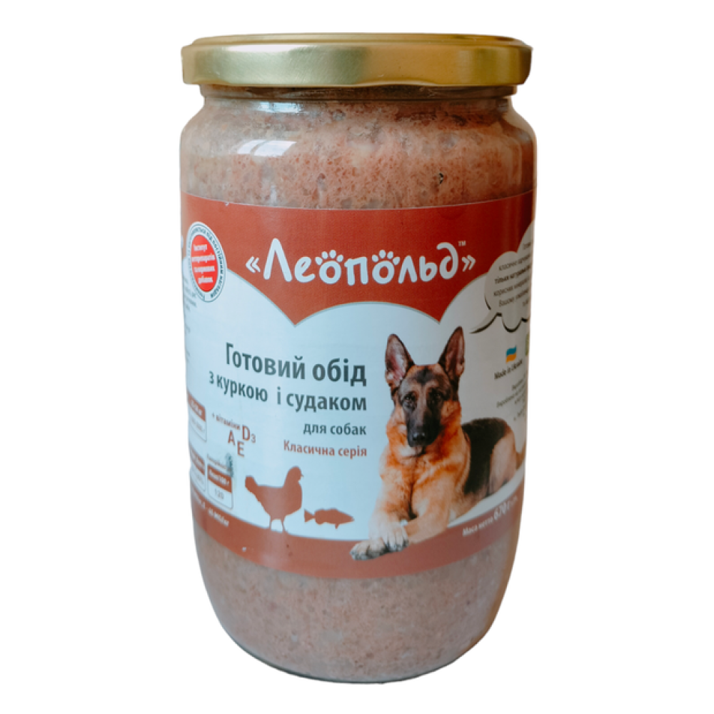 Вологий корм для собак Леопольд Готовий обід з куркою і судаком, 670г- це повноцінне харчування до складу якого входять тільки натуральні продукти, а також багато корисних мінералів і вітамінів, що дозволяють Вашому улюбленцю бути здоровим і задоволеним.