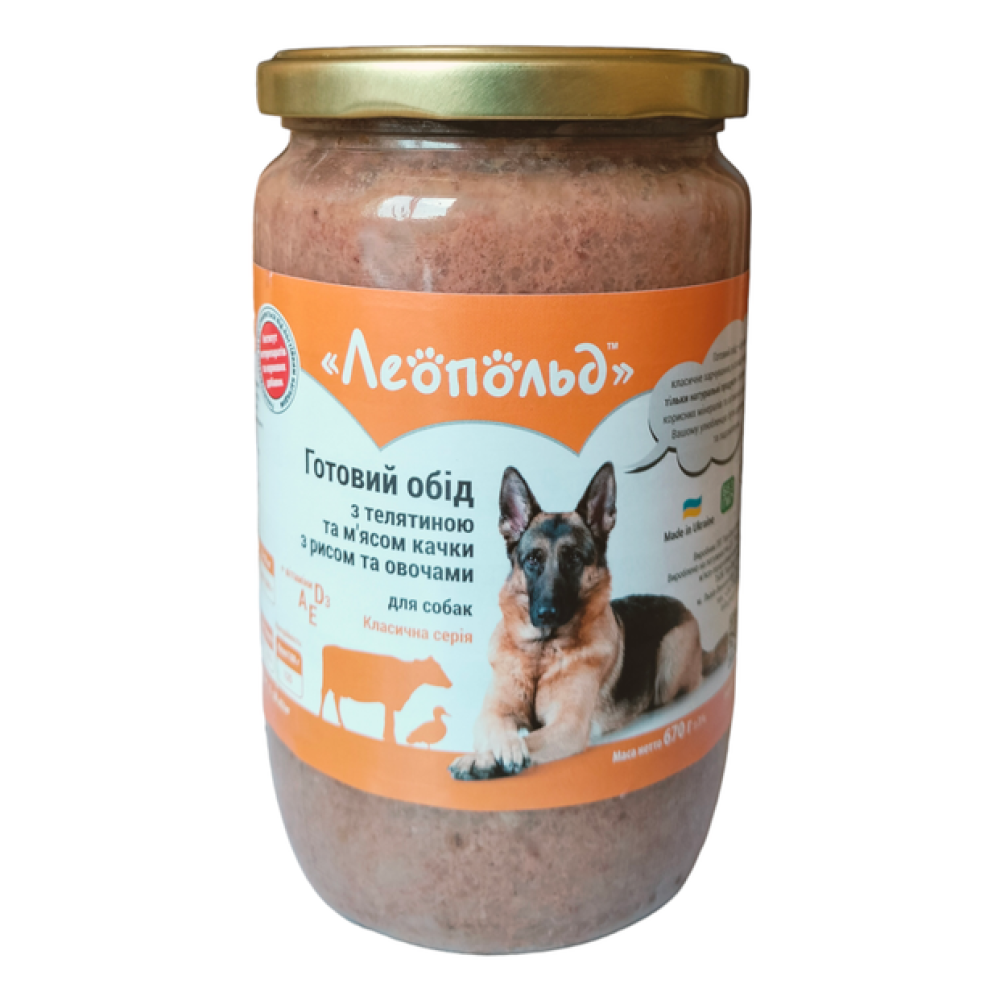 Вологий корм для собак Леопольд Готовий обід з телятиною та м'ясом качки з рисом та овочами 670г - це повноцінне харчування до складу якого входять тільки натуральні продукти, а також багато корисних мінералів і вітамінів, що дозволяють Вашому улюбленцю бути здоровим і задоволеним.