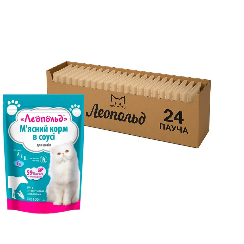 Рагу з телятиною в соусі з овочами-це збалансований вологий корм для кішок Леопольд М'ясний корм для повноцінного харчування домашніх улюбленців. Смачне рагу зі шматочків телятини з овочами, приготовлені у ніжному соусі, стане улюбленою їжею кішки. Консерви Леопольд на 59% складаються з м'яса та м'ясних продуктів. Корм виготовлений тільки із натуральних інгредієнтів високої якості. Велика кількість білка (14%), що міститься у м'ясній складовій, та достатня кількість жиру (5%) збагачують організм тварини, надають їй сили та активності протягом цілого дня. Натуральний корм для кішок від українського виробника Леопольд у консервованому вигляді не містить барвників, ароматизаторів, сої, консервантів, підсилювачів смаку.