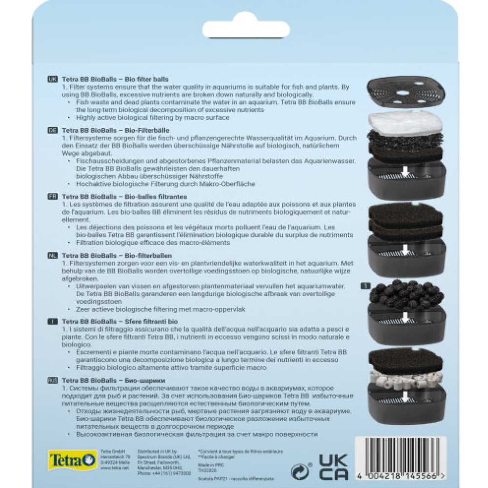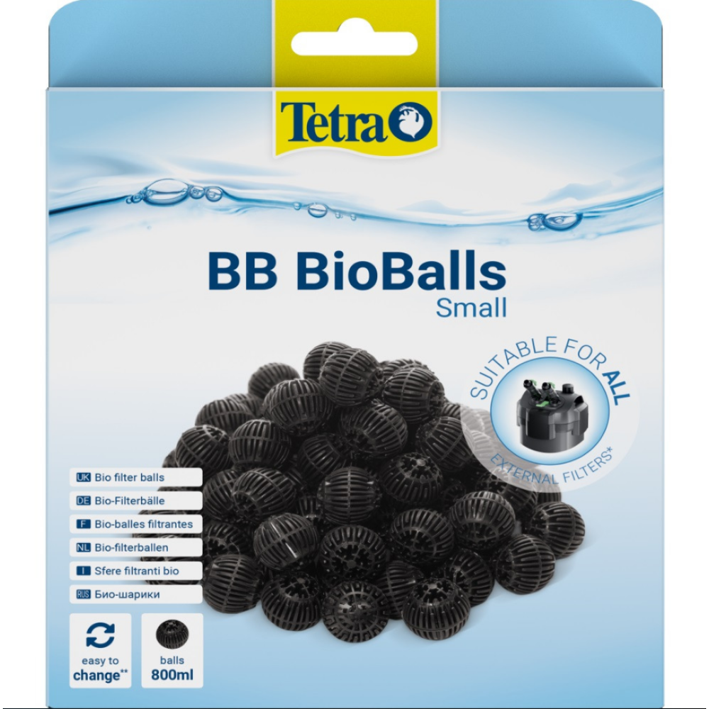 Оригінальний наповнювач фільтра Tetra «BioBalls» являє собою біо-кульки, які ефективно чистять воду, видаляючи з неї великі частки бруду. Вони охоплюють велику площу поверхні акваріума, що сприяє розмноженню потужної колонії бактерій нітрифікаторів, і біологічній фільтрації води