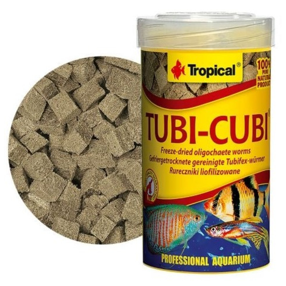 Tropical Tubi Cubi — це високобілковий натуральний корм для всіх акваріумних риб у вигляді маленьких поживних кубиків. Виготовлений із заморожених і висушених чистих червоних черв'яків Tubifex. Це улюблена ласощі для м'ясоїдних риб і водних черепах. Добавка зеоліту має позитивний вплив на травну систему і виведення токсичних речовин з організму риб.
