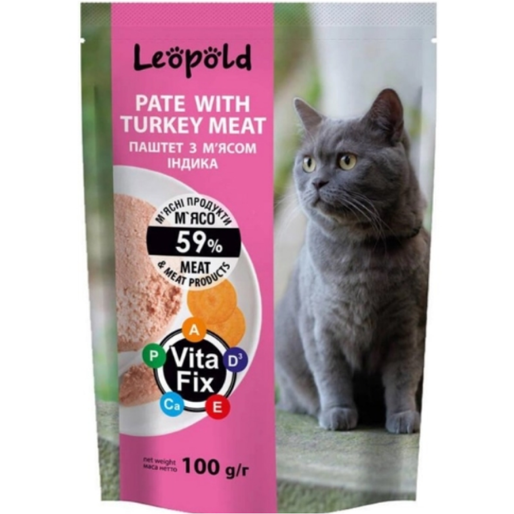 Вологий корм у вигляді паштету Леопольд – це повноцінне та збалансоване харчування для дорослих котів. У ньому міститься не менше 59% м'яса та м'ясопродуктів, а також усі необхідні вітаміни та мінерали. Корм має ніжну консистенцію і приємний смак, який сподобається вашому коту. Виготовлений із високоякісних інгредієнтів, що пройшли ретельний контроль якості. Корм не містить ГМО, консервантів та барвників.