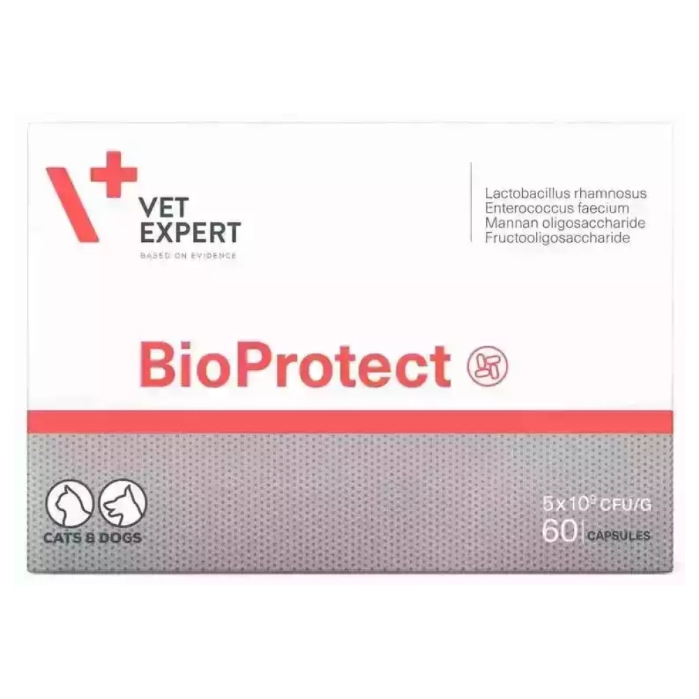 BIOPROTECT VETEXPERT рекомендований для собак і кішок з порушенням балансу мікрофлори в шлунково-кишковому тракті, викликаним діареєю, антибіотикотерапією або дегельмінтизацією, а також для тварин, які ростуть і схильними до запорів.