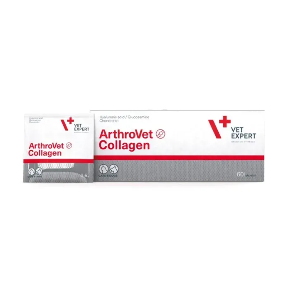VetExpert ArthroVet Collagen - препарат для собак і котів із порушеннями функцій суглобів і суглобових хрящів. Засіб є першим ветеринарним препаратом на основі колагену, який складається з біоактивних пептидів. Препарат підходить як для молодих зростаючих тварин, так і для літніх собак і котів, які страждають на остеоартрит.