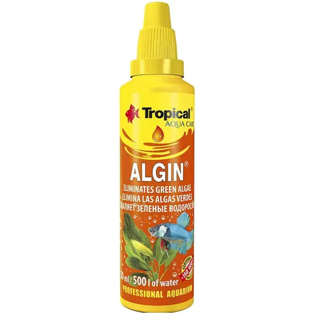 Tropical Algin - це найкращий засіб у розв'язанні проблеми з розростанням зелених водоростей в акваріумі. Засіб - рідкої консистенції, здатний повністю позбавити воду від помутніння та нальотів, які викликані прогресивними водоростями, дезінфікувати акваріумні рослини та очистити воду, а також у рази уповільнити розвиток водоростей у спекотний період року. Важливим є і той чинник, що Algin обробляє як рослини, а й самі джерела поширення водоростей. Врятувати свої рослини, очистити акваріум від нальоту та одночасно забезпечити рибам оптимальний розвиток можливо з Tropical Algin.