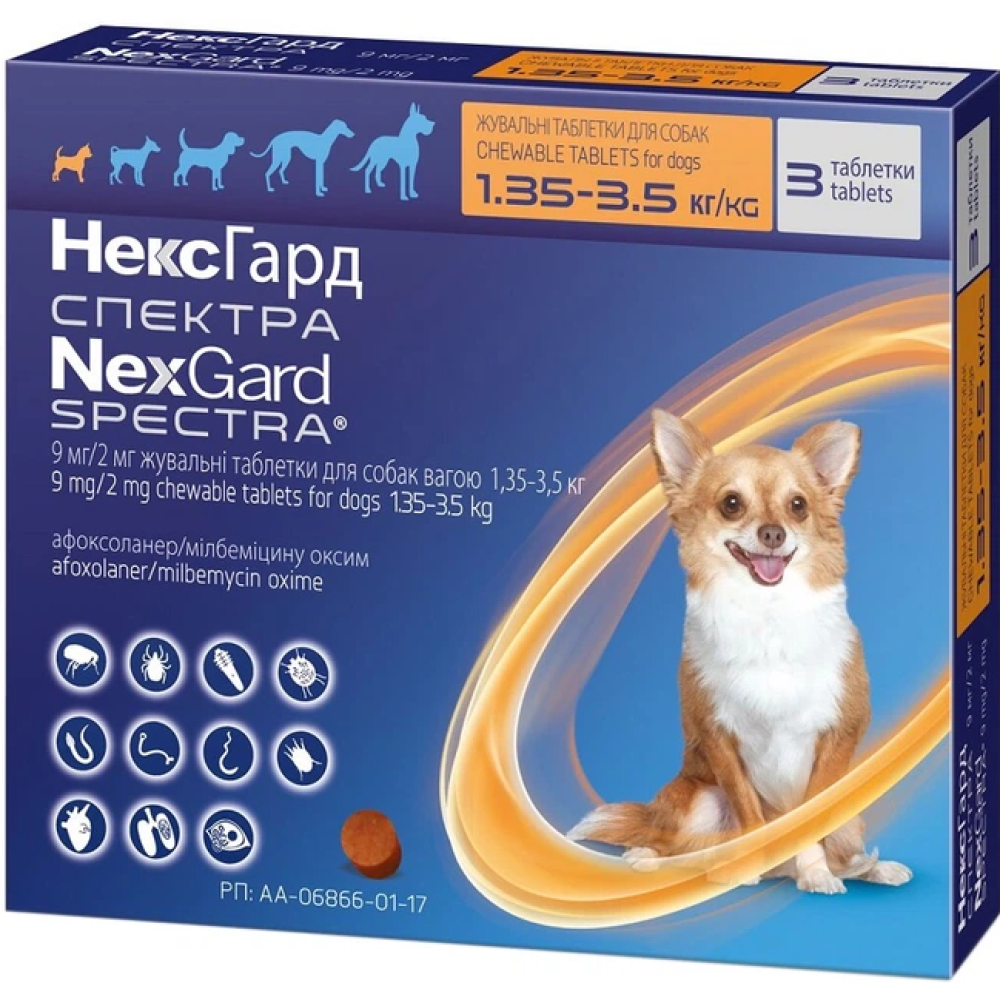 • Таблетка для собак вагою 2–3.5 кг: 9 мг афоксоланера та 2 мг мільбеміцину оксиму