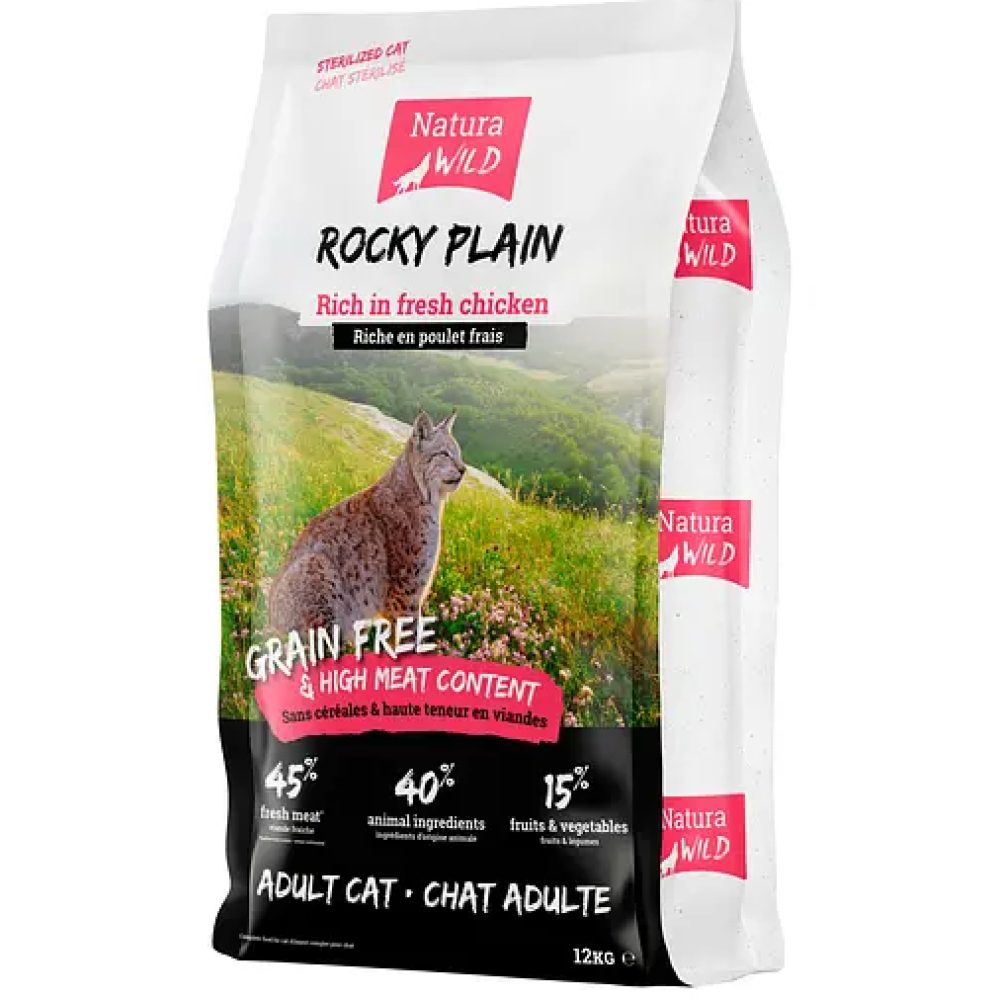 Natura Wild Rocky Plain – це беззерновий корм, спеціально розроблений для кастрованих та стерилізованих кішок, щоб задовольнити їхні потреби в поживних речовинах. Соковите свіже куряче м'ясо складає 45 % складу, забезпечуючи вашого вихованця багатим джерелом білка. Додатково дегідрований білок птиці становить 25 %, що сприяє підтримці м'язової маси і загального здоров'я.