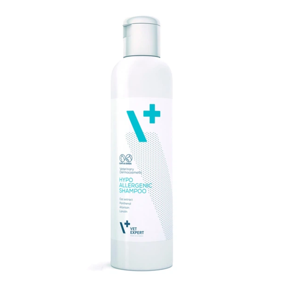 Vet Expert Hypoallergenic Shampoo – дермокосметичний шампунь для тварин із чутливою шкірою, схильною до подразнення, алергії, надмірної сухості або непереносимості інших шампунів. Безпечний для тварин у період росту.